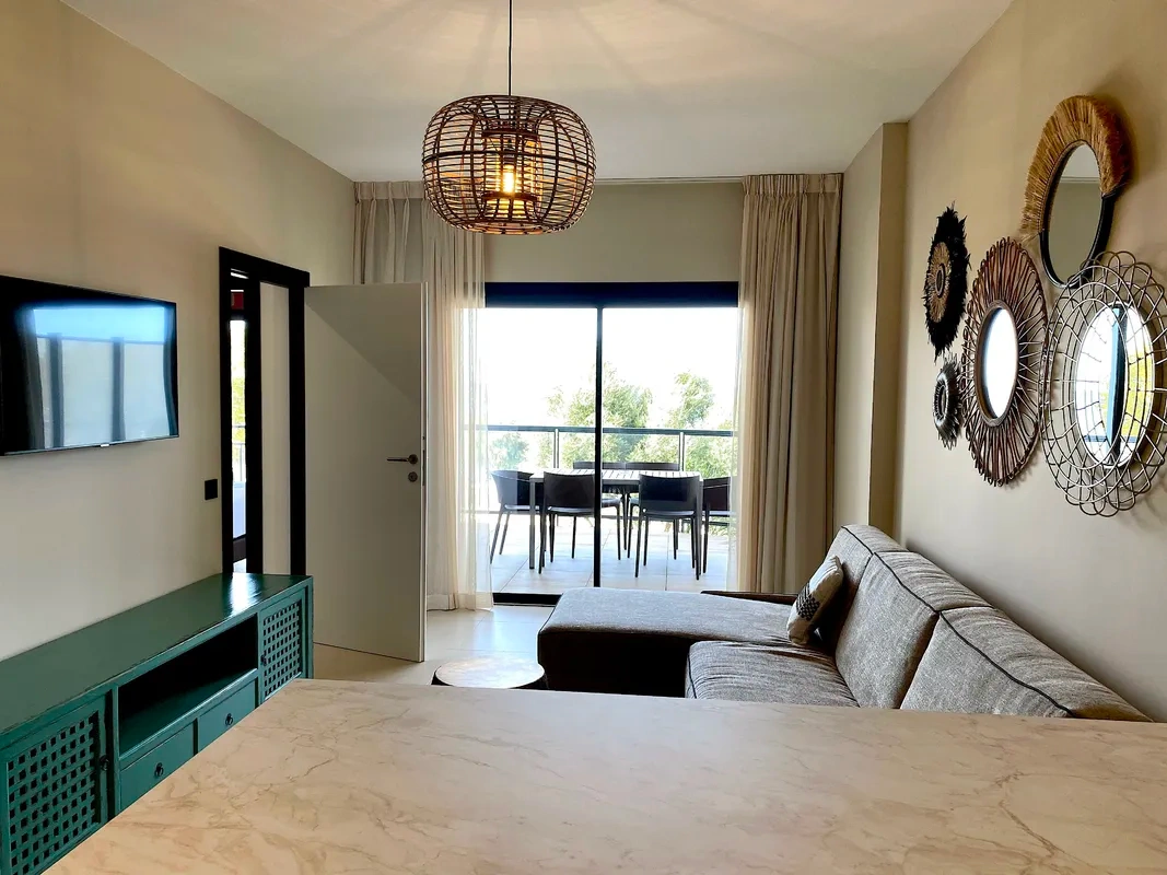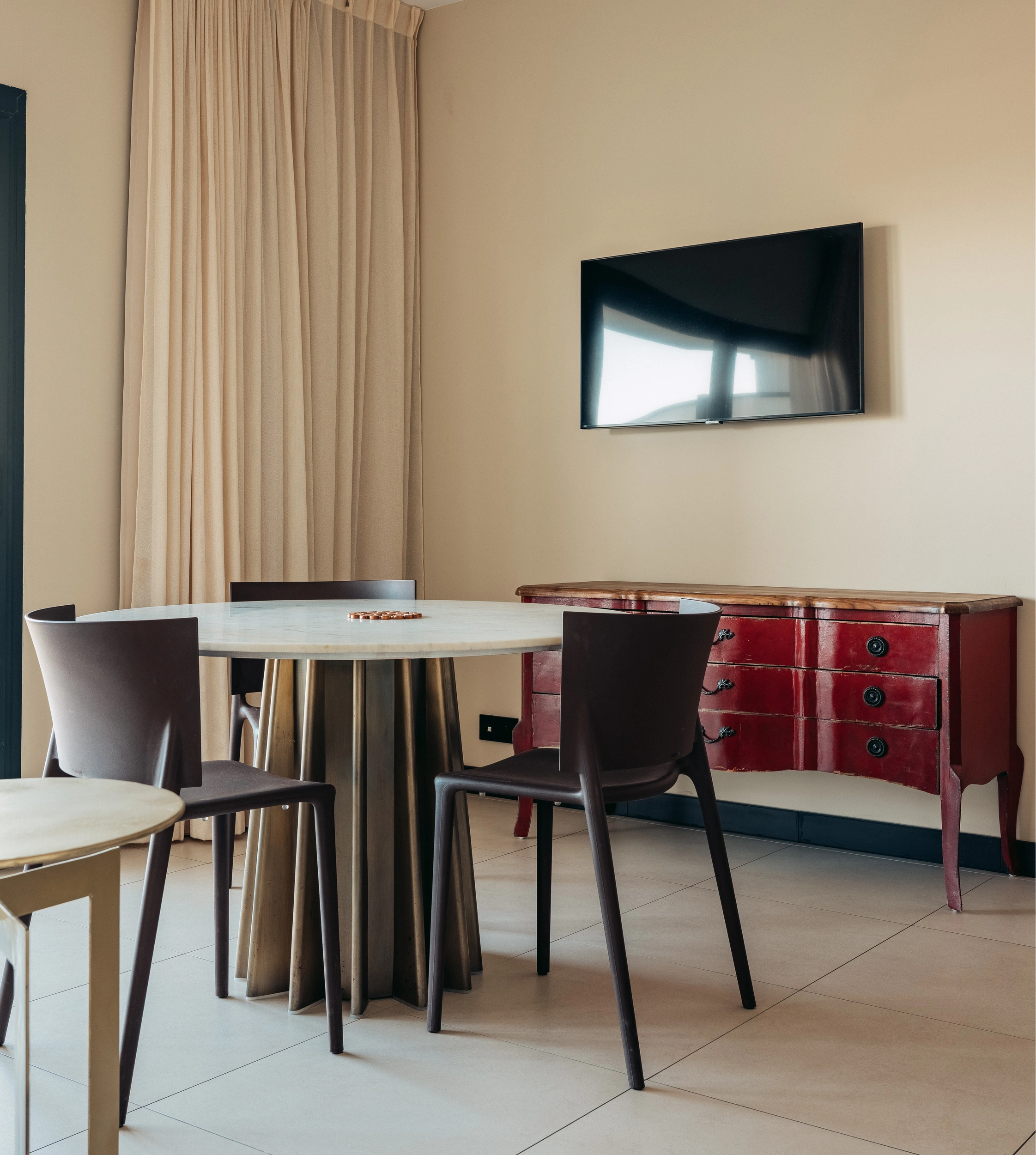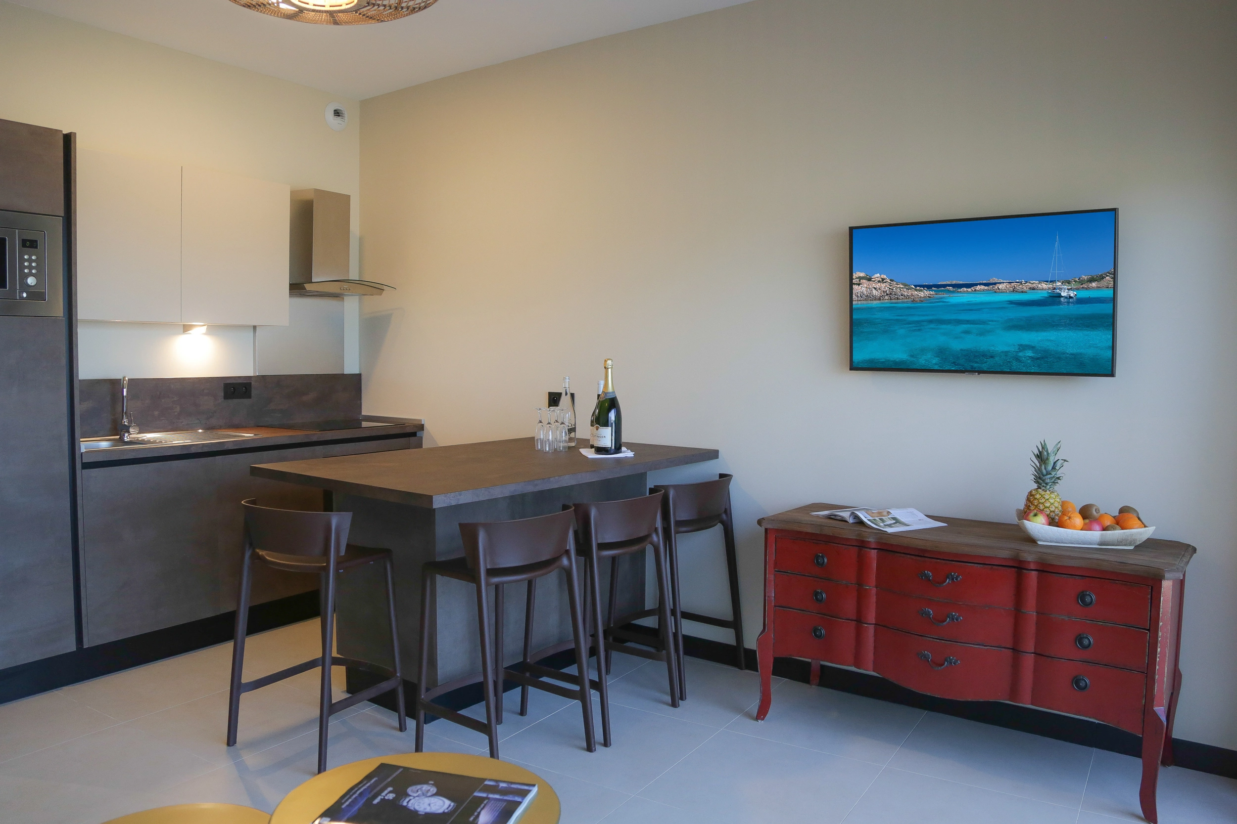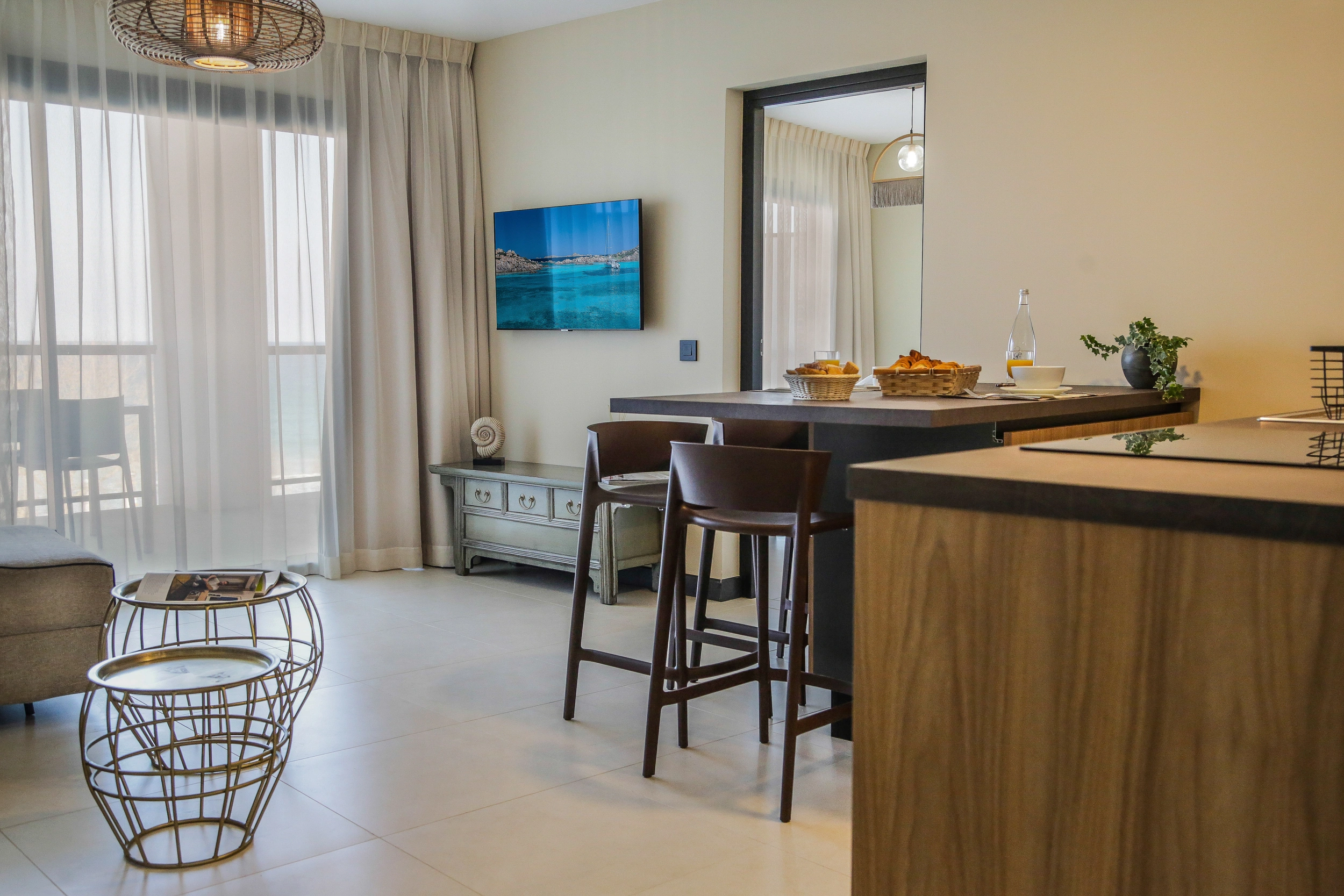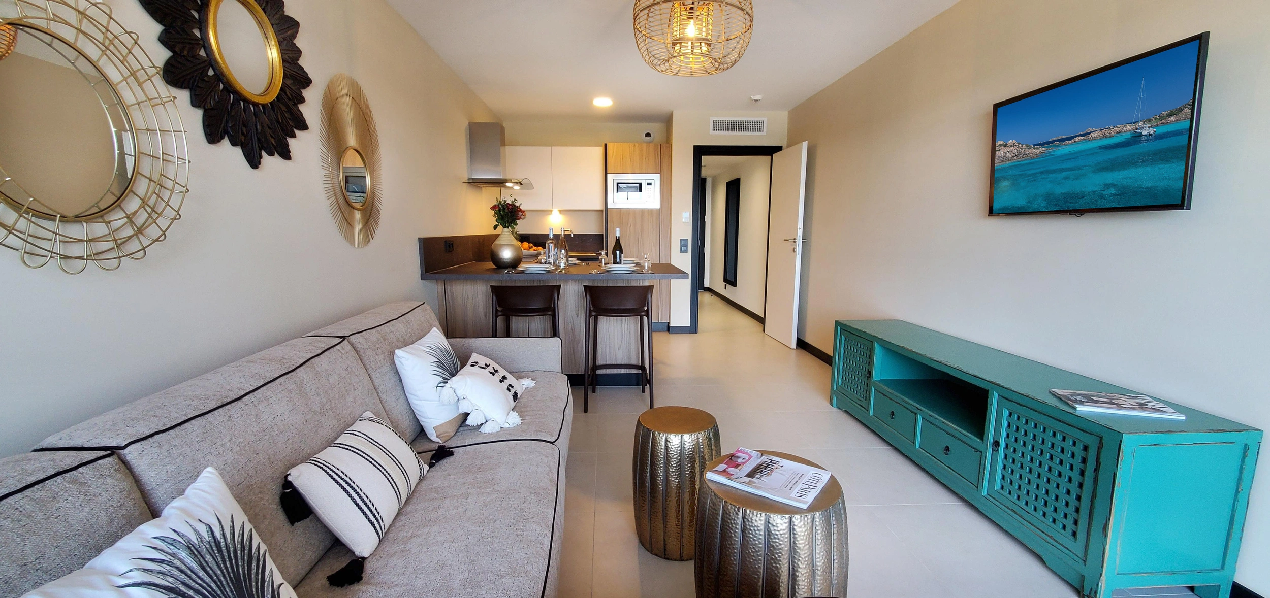 Avec ses 40 m² baignés de lumière, Funtanella est une invitation à ralentir. Pensée pour deux, mais prête à accueillir jusqu’à quatre personnes, cette suite offre une chambre avec dressing, une salle de bain à l’italienne, un salon avec canapé convertible et une cuisine ouverte où préparer les instants simples du quotidien. Derrière les baies vitrées, la mer s’étend à perte de vue. Sur la terrasse, on savoure un café face à l’horizon, on s’attarde au coucher du soleil. Tout y est paisible, fluide, naturel. Comme si le temps s’accordait à votre rythme. Six appartements de cette catégorie sont accessibles aux personnes à mobilité réduite.