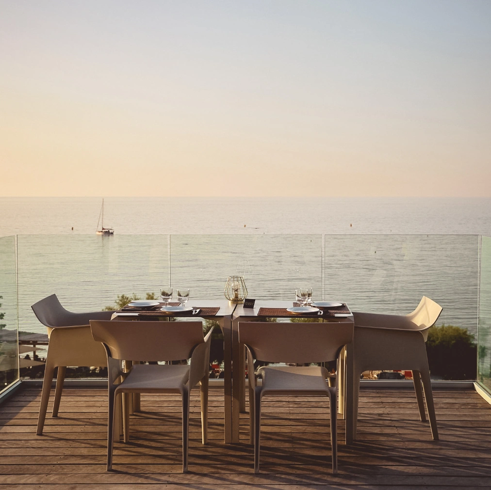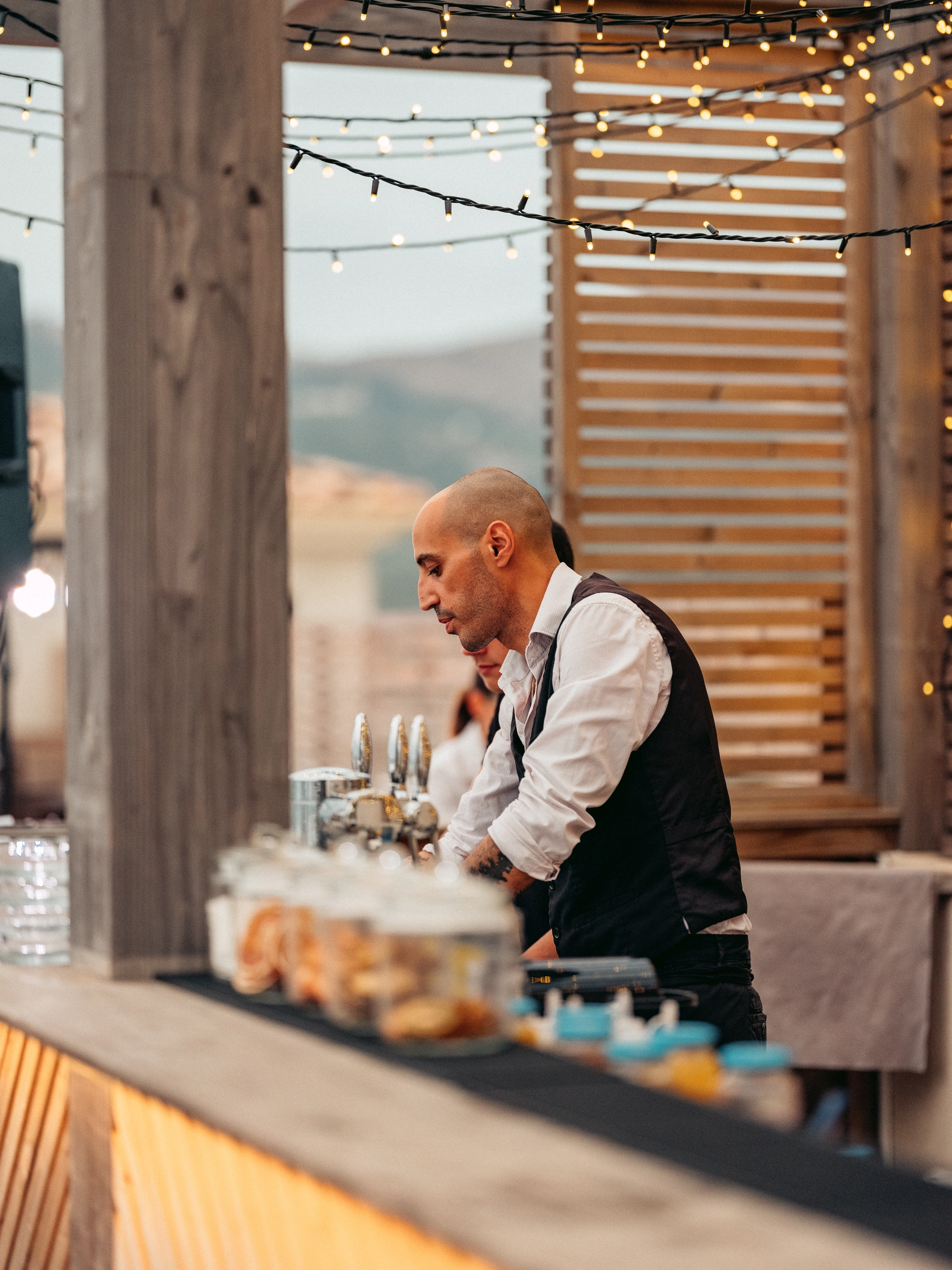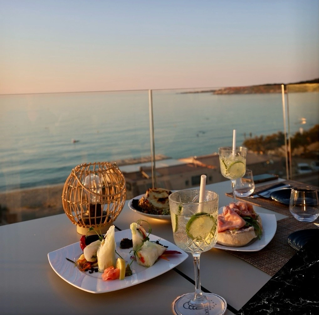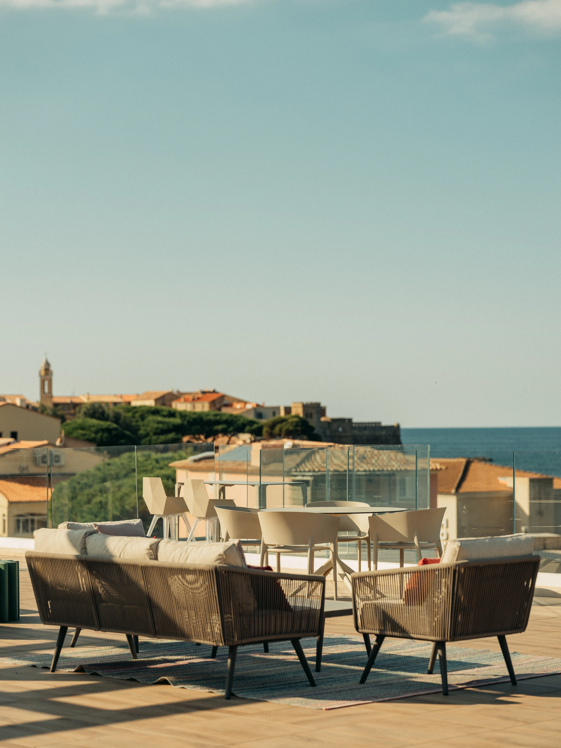 Tout en haut de la résidence Dolce Paese, La Nomade étend ses terrasses comme deux promontoires baignés de lumière. Ce rooftop unique, suspendu entre ciel et mer, domine la baie d’Algajola, les villages perchés de Balagne et l’horizon sans fin de la Méditerranée. Le panorama y est à couper le souffle, de jour comme de nuit. Reliées par un escalier monumental aux allures de palais, les deux terrasses offrent un espace fluide, élégant, et profondément apaisant. C’est un lieu où l’on vient autant pour la vue que pour le moment qu’on y passe, entre contemplation, partage et rêverie.
